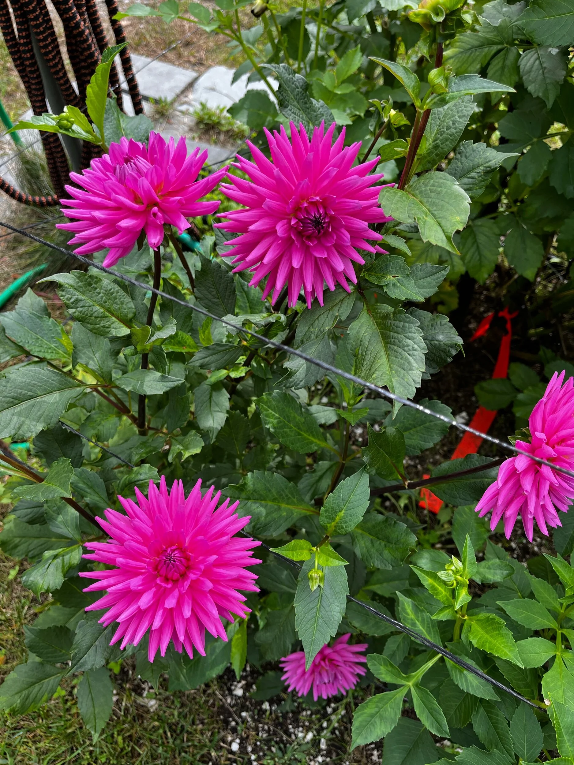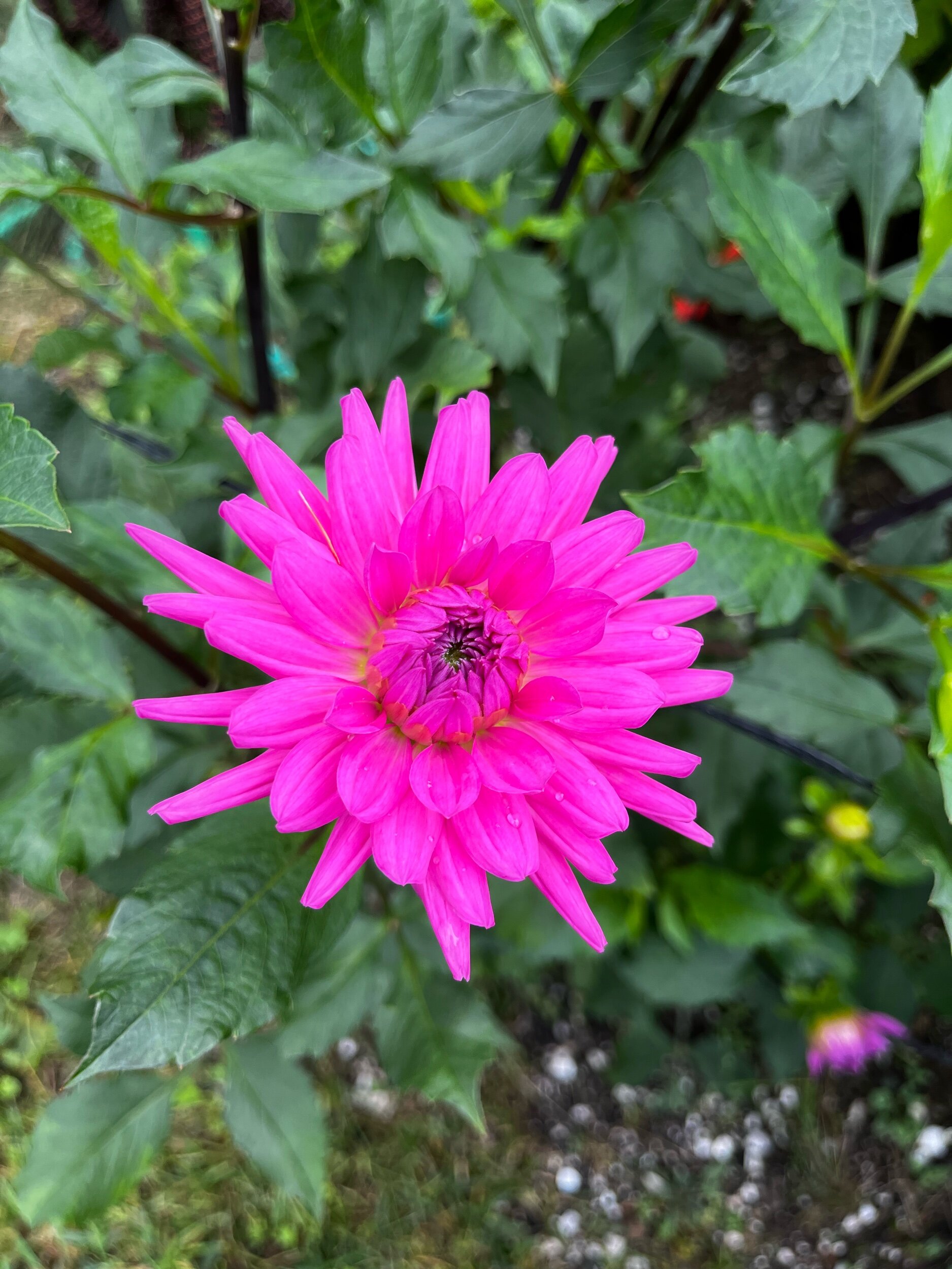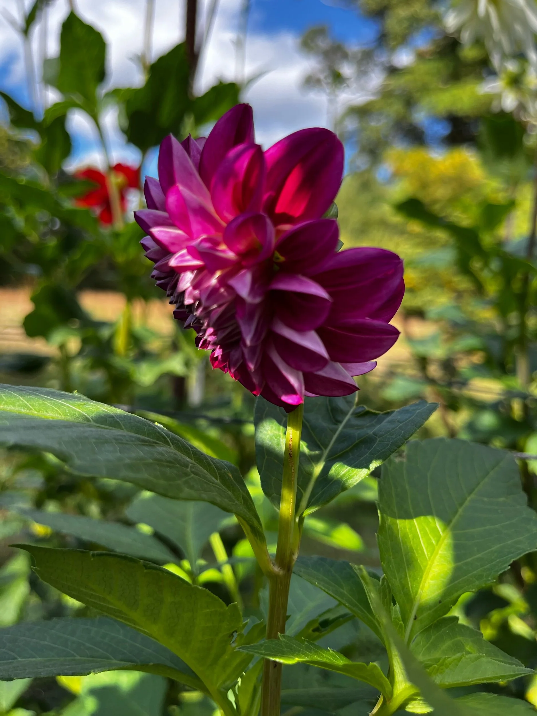 Dark red with yellow and purple centers. Similar to Bacardi, in that I wasn't sure I'd like this one, but now think it's beautiful. Blends well with many colors. Small (BB) 4” Informal Decorative blooms on 4’ plants.